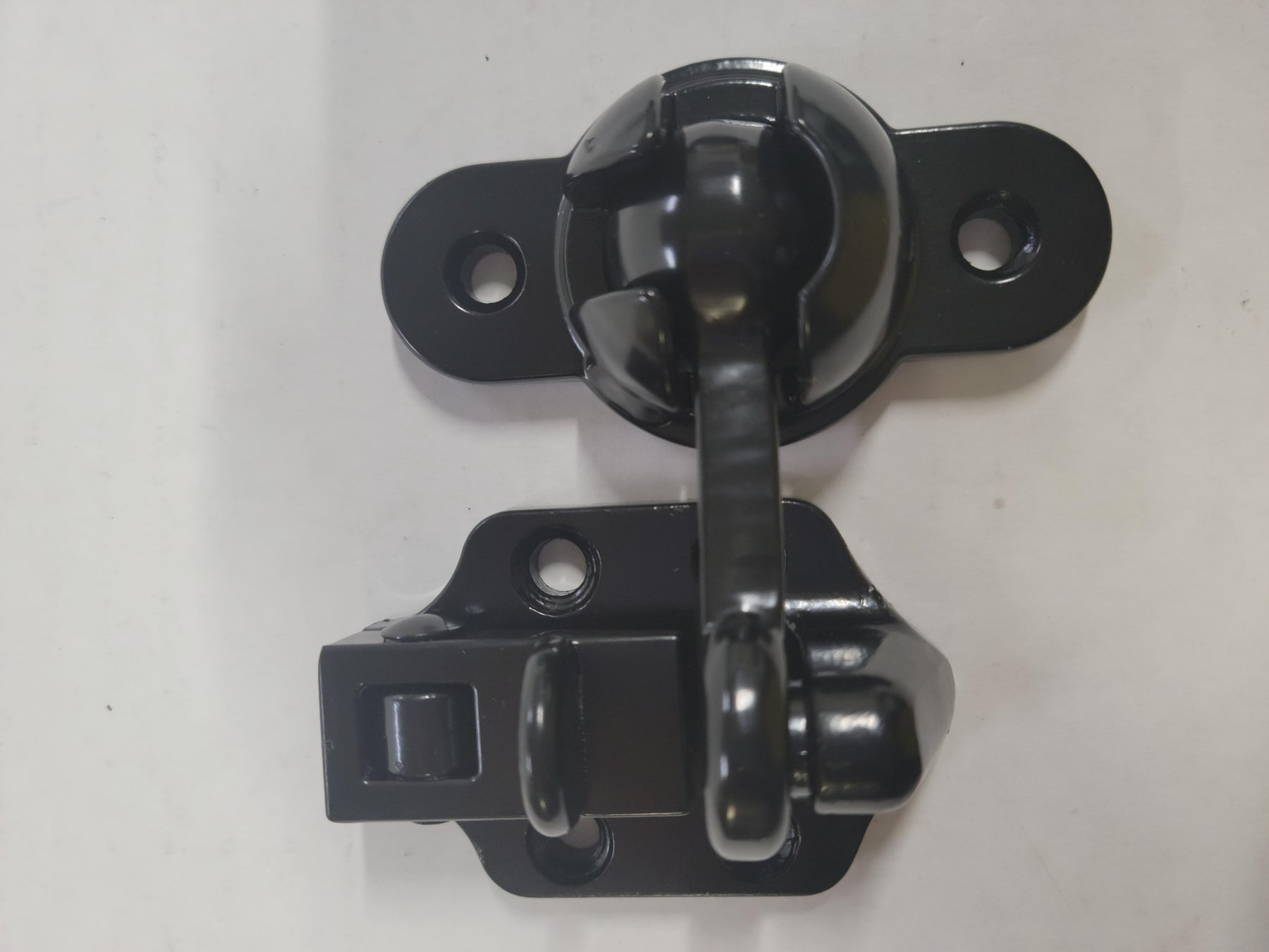The "arm" side that installs on the trailer door can also be installed so it fastens into the catch from the side, although it's slightly harder to disengage it.