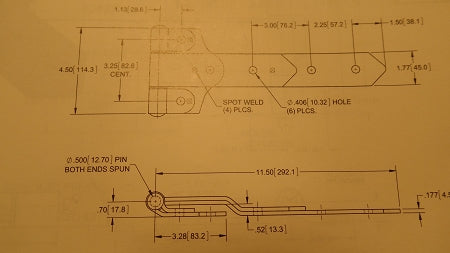 11.5" from center of hinge pin to tip of strap. Hinge pin is 4.5" tall. Weighs 2 lbs, 12 ounces each. Takes six 13/32" bolts (or 10.32 metric).