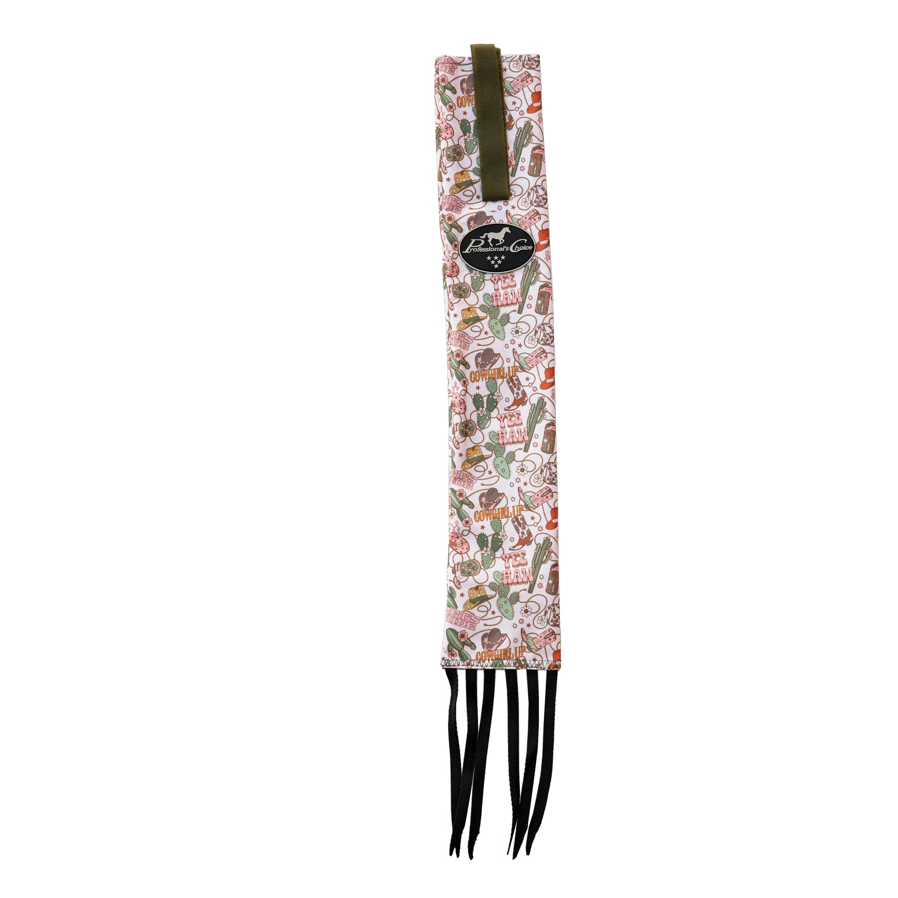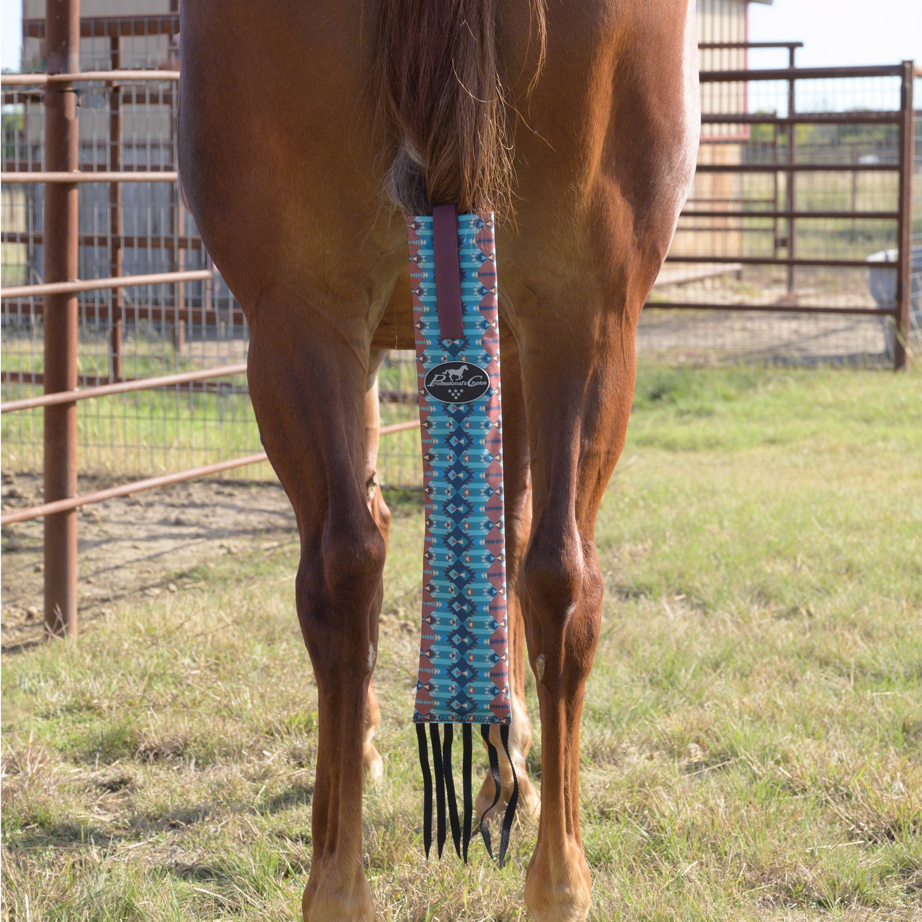 The deluxe tail bag is designed with a hook and loop top closure, durable material, and fringe at the bottom to help swat away pesky bugs.
