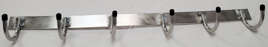 Get everything off your tack room floor! This lightweight but sturdy, welded aluminum 6-hook, 36" rack easily mounts to trailer walls to keep tack organized. Comes complete with a black vinyl cap glued to each hook. To mount, drill your own mounting holes or weld on. Works with both aluminum and steel trailers, with no adverse reaction.